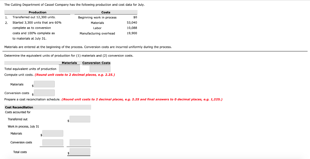 Solved The Cutting Department Of Cassel Company Has The Chegg Com